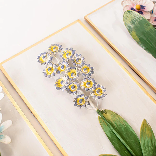 Each metal flower is individually shaped and painted, so no two sets are exactly alike. The 3D construction catches light throughout the day, creating shadows and highlights that shift as the sun moves. Blue hydrangeas, yellow daisies, pink tulips, white blooms—each framed in warm gold that works with literally any decor style.