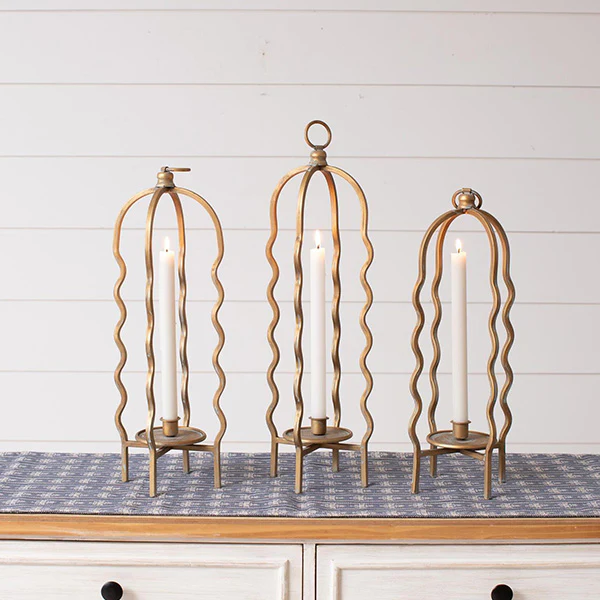 Sculptural Wavy Distressed Gold Metal Taper Candleholders, Set of 3
